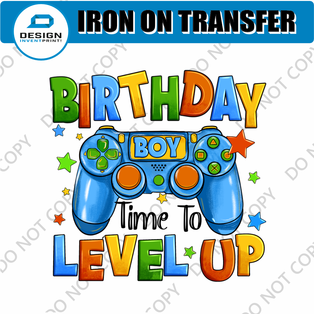 Kids Birthday Gaming DTF Transfer Time to Level Up - Gift Do it Yourself Iron On Heat Press Shirt Any Material Long Lasting Full Colour